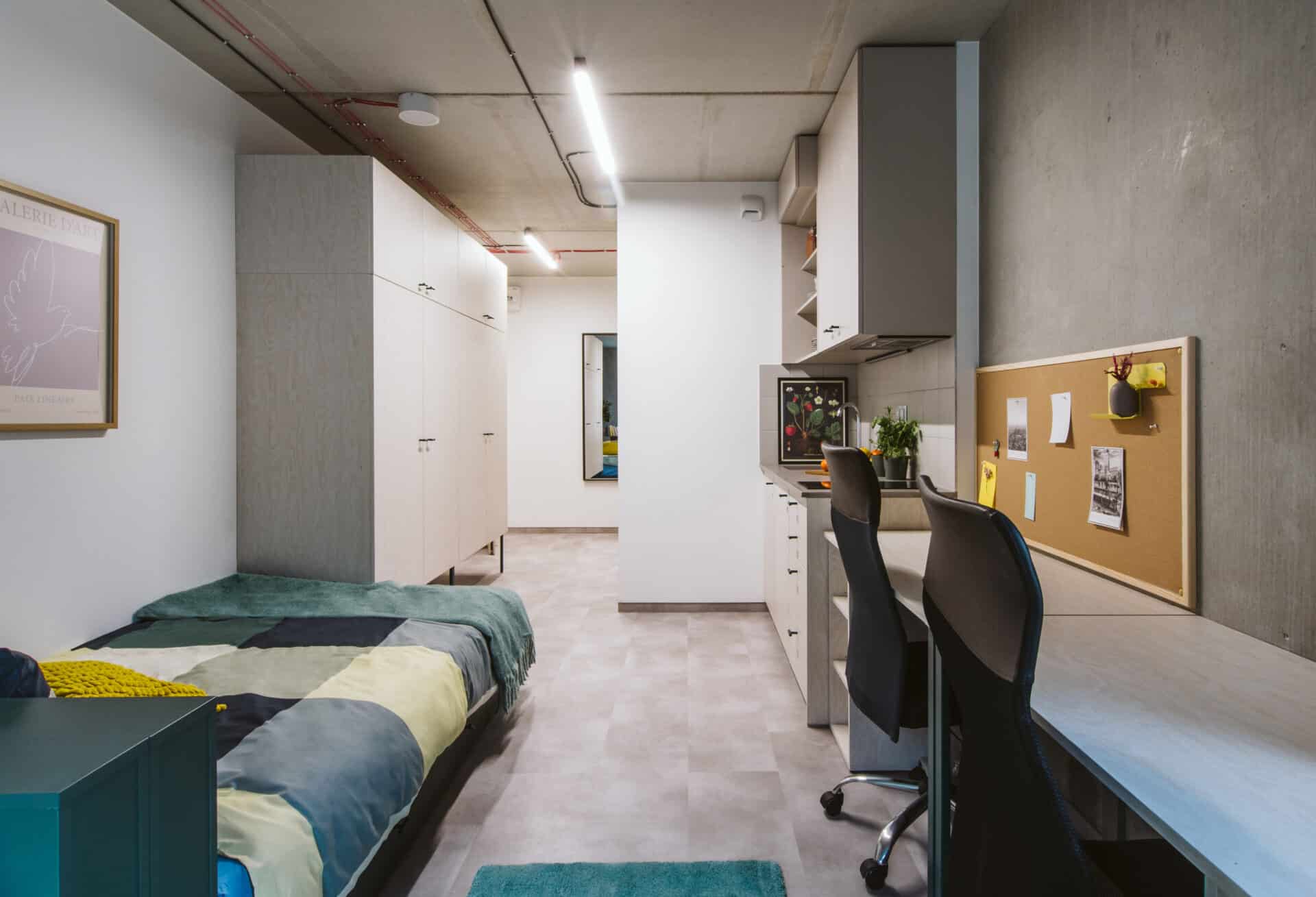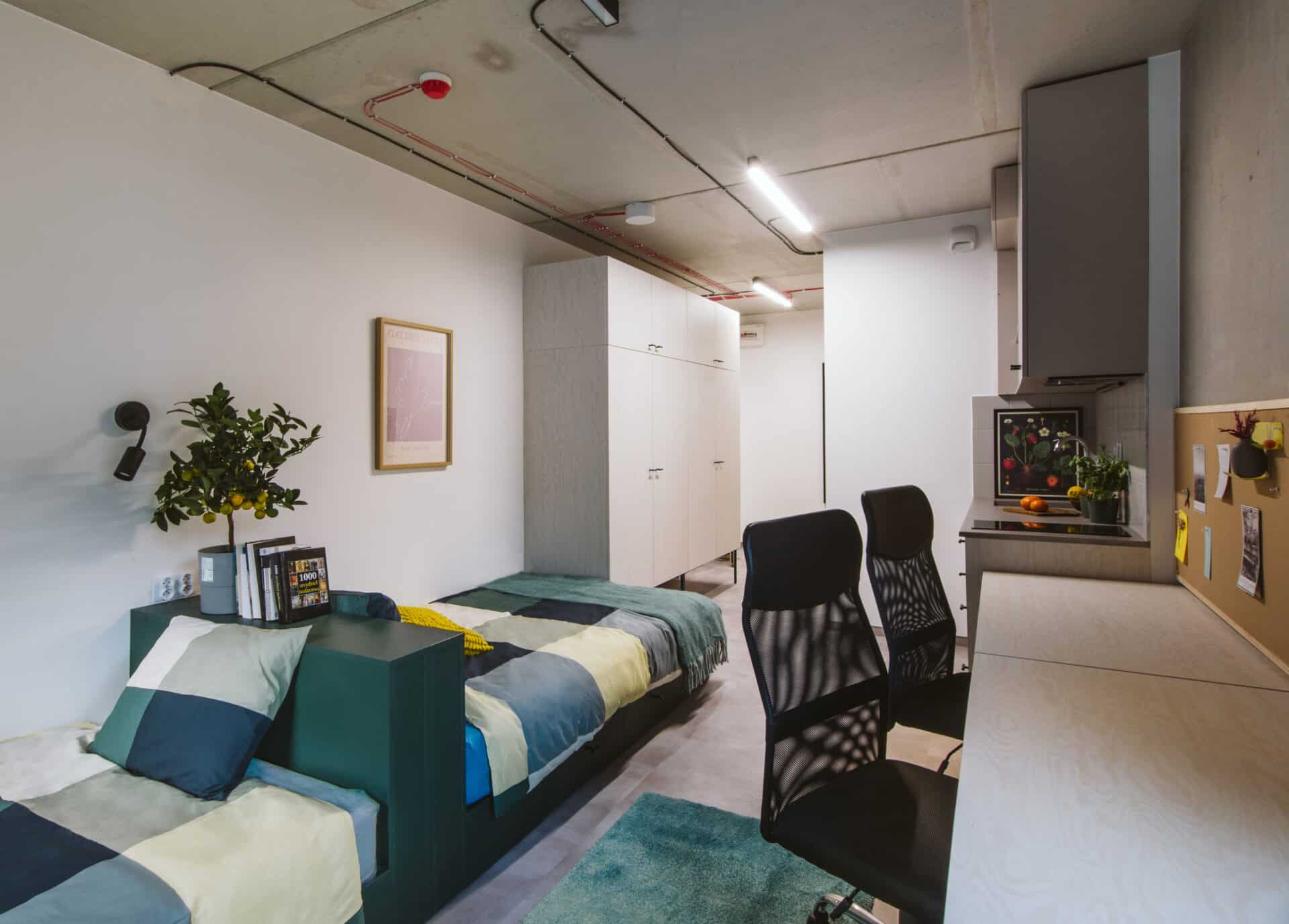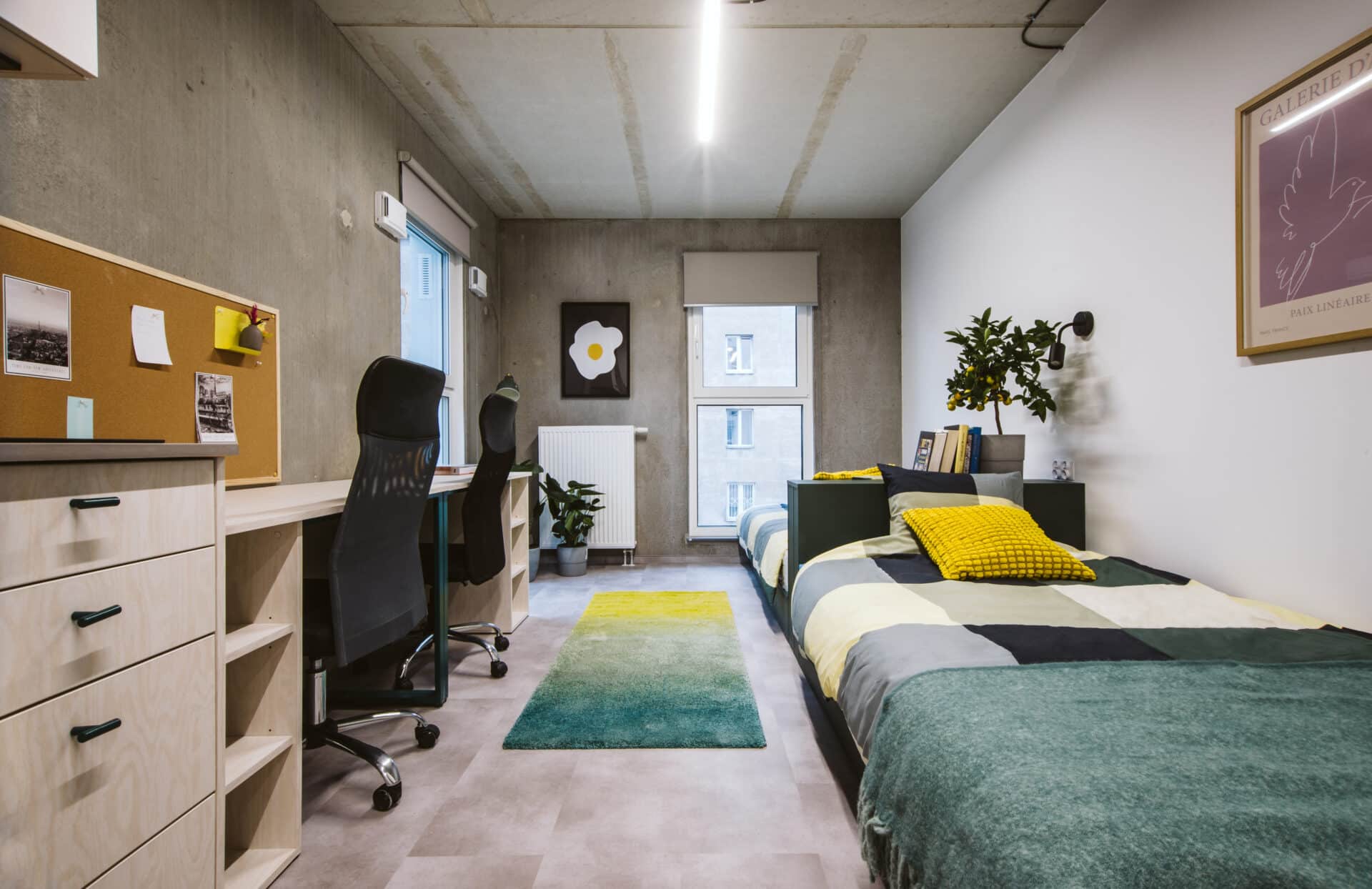 The room includes two beds (120 × 200 cm), individual desks, and separate storage, giving each resident their own space to study, relax, and feel at home.