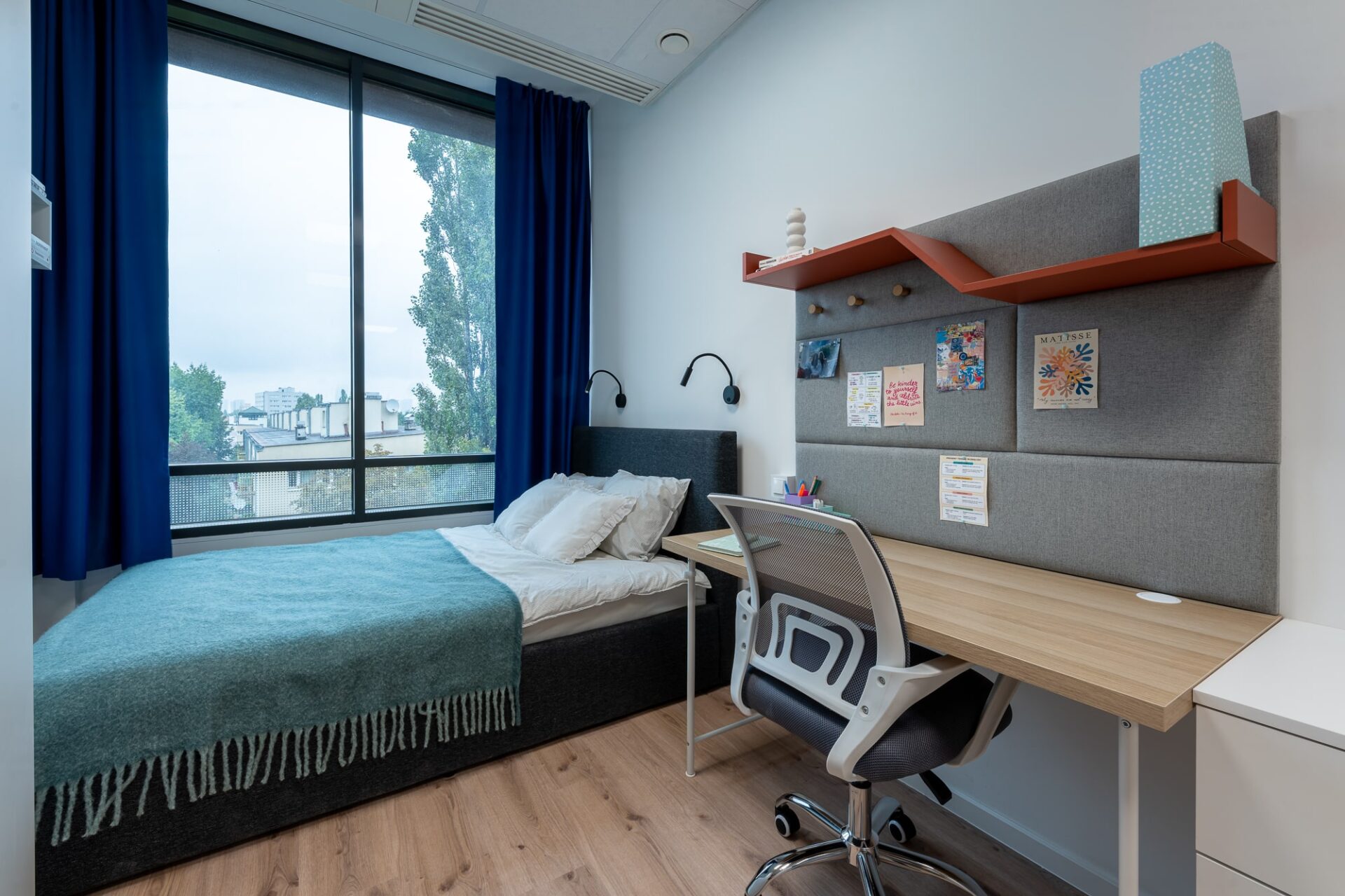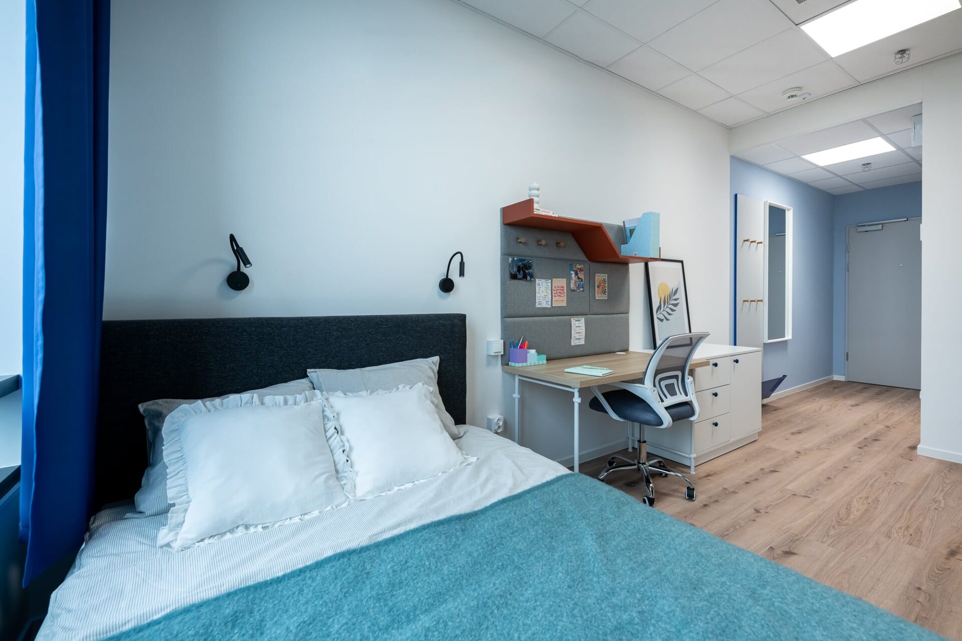 La habitación cuenta con dos camas individuales (90 × 200 cm), escritorios individuales y armarios, lo que proporciona a cada residente un espacio personal para estudiar, trabajar y relajarse. Los residentes también tienen acceso a una pequeña cocina y un cuarto de baño privados.