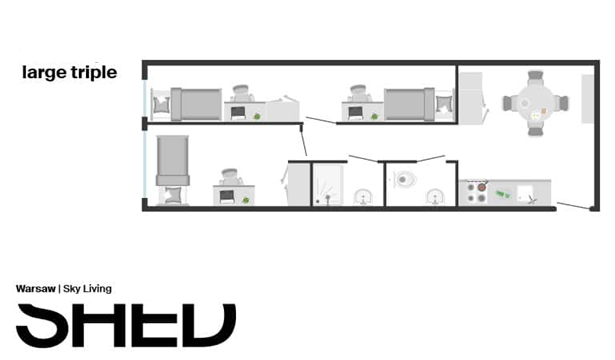 As part of the apartment, Twin Room residents share access to a separate living area with kitchenette, ideal for cooking, gaming, and spending time together, as well as two bathrooms — one with a shower and an additional separate toilet — ensuring extra convenience for shared living.
